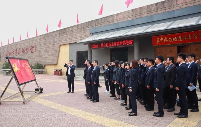 房地產(chǎn)公司黨委扎實開展黨史學習教育。圖為該公司黨員在冀中冉莊地道戰(zhàn)紀念館重溫入黨誓詞